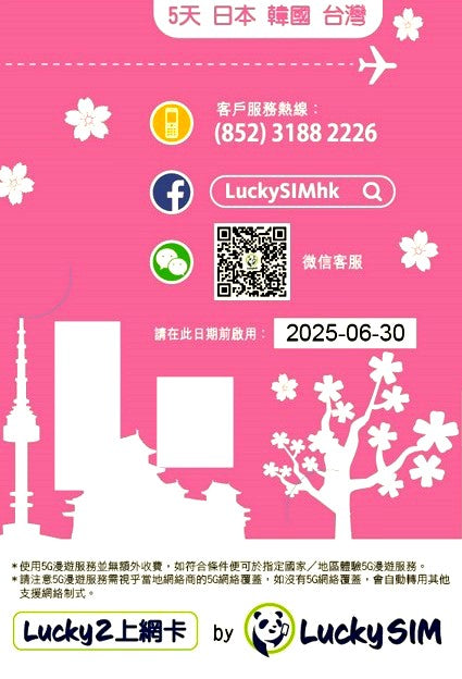 Lucky2 【日本 韓國 】日韓 5G/4G 5日 無限數據卡 可選擇eSIM