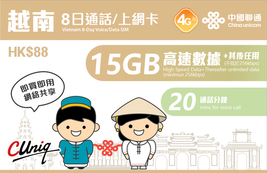 中國聯通【越南】8日 通話/上網卡 (15GB高速其後任用數據 20通話分鐘)